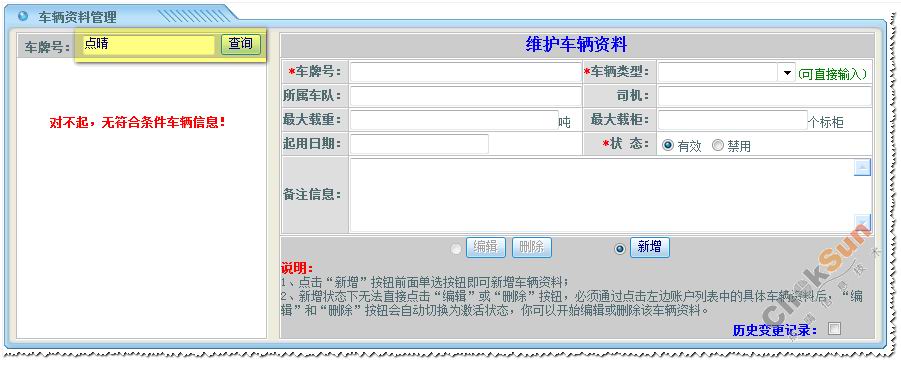 在添加車輛信息之前,請先查找系統上是否已經存在相應的車輛名稱,再確定是否需要增加車輛信息。如:需添加車輛名為“點晴”,先查找“點晴”,系統顯示找不到相應記錄,再進行新增車輛信息。