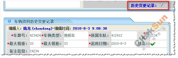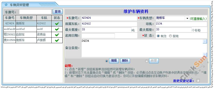 在車輛信息列表中,點取某一車輛名稱,右邊維護資料方塊則顯示了所選取的車輛詳細信息。 修改車輛的信息,然后點擊【編輯】保存修改信息。 點擊【刪除】刪除所選取的車輛信息。 3、查看歷史變更記錄